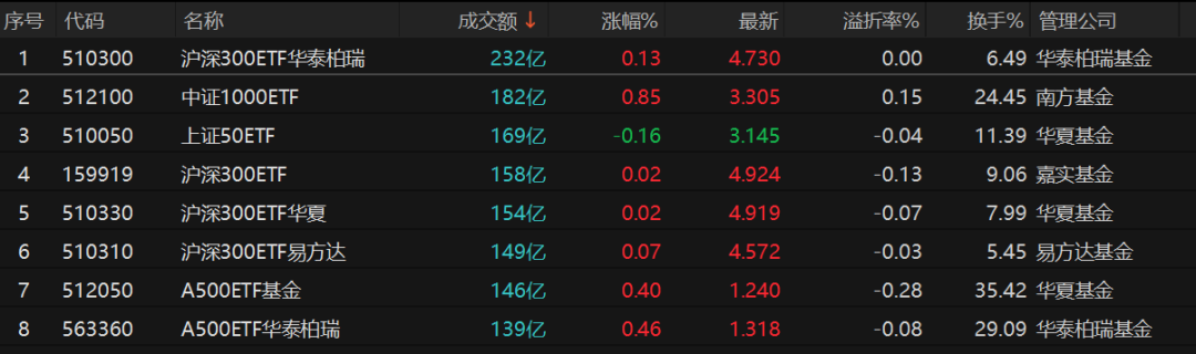 部分宽基ETF成交额更是创上市以来新高。其中,南方中证1000ETF成交182亿元,创2016年11月上市以来新高;嘉实沪深300ETF成交158亿元,创2012年5月上市以来新高;易方达沪深300ETF成交149亿元,创2013年3月上市以来新高。
