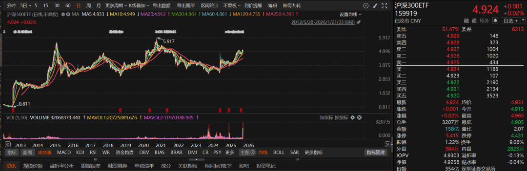 具体来看,华泰柏瑞沪深300ETF成交232亿元,远超1月20日136亿元的成交额,成交额处于历史高位。