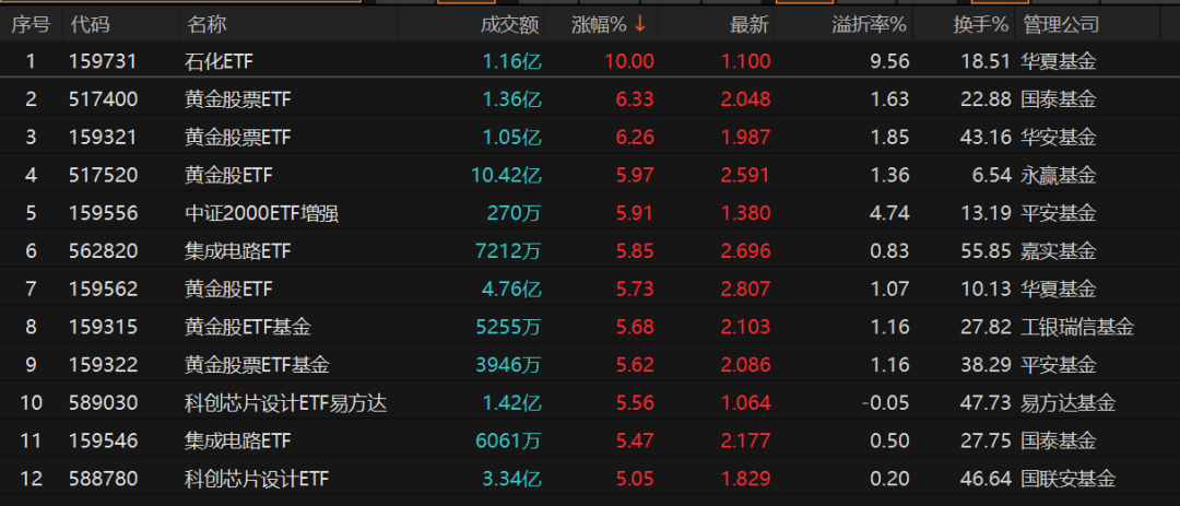 从1月21日ETF表现来看,黄金股主题ETF、集成电路主题ETF、科创芯片主题ETF等表现十分抢眼。值得注意的是,由于资金涌入,多只ETF出现较大幅度溢价。其中,由于临收盘大单买入,华夏石化ETF涨停,目前溢价率超过9%。